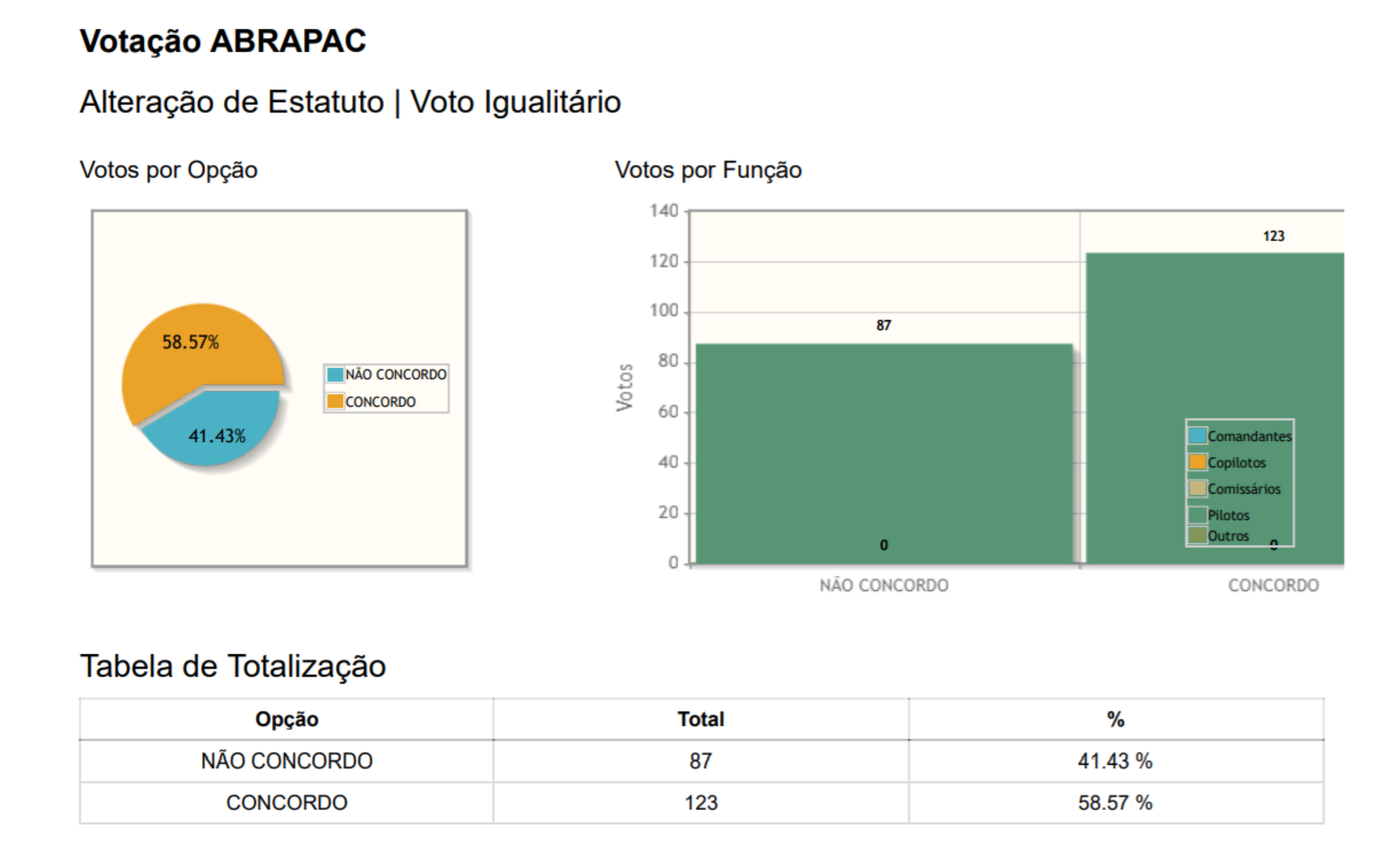 Assim sendo, em respeito ao seu Estatuto e aos seus associados, não haverá divulgação publica (ou a pedido) da lista com os nomes dos votantes e as opções nas quais votaram, sendo suficiente para todos os efeitos a divulgação do resultado contendo o computo total dos votos e a número de votos em cada opção, já divulgado no endereço https://www.pilotos.org.br/post/errata-resultado-da-votacao.